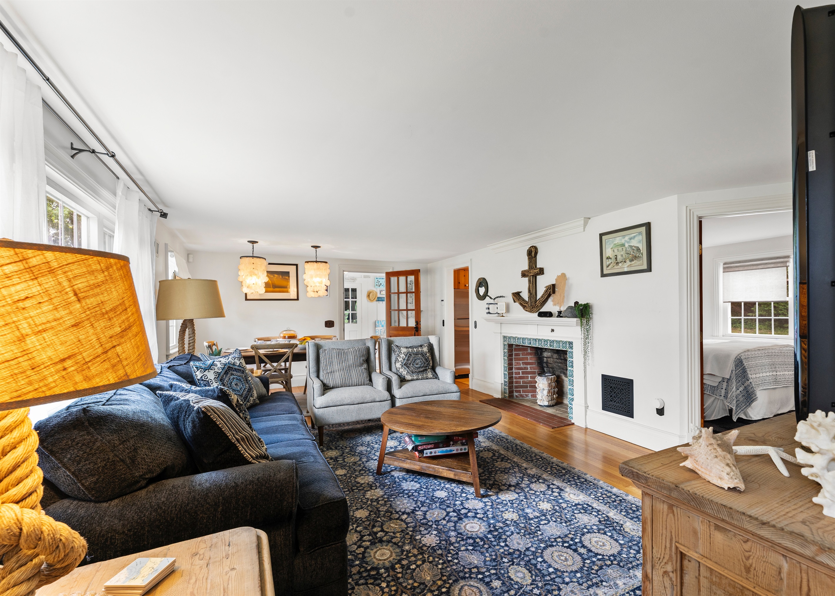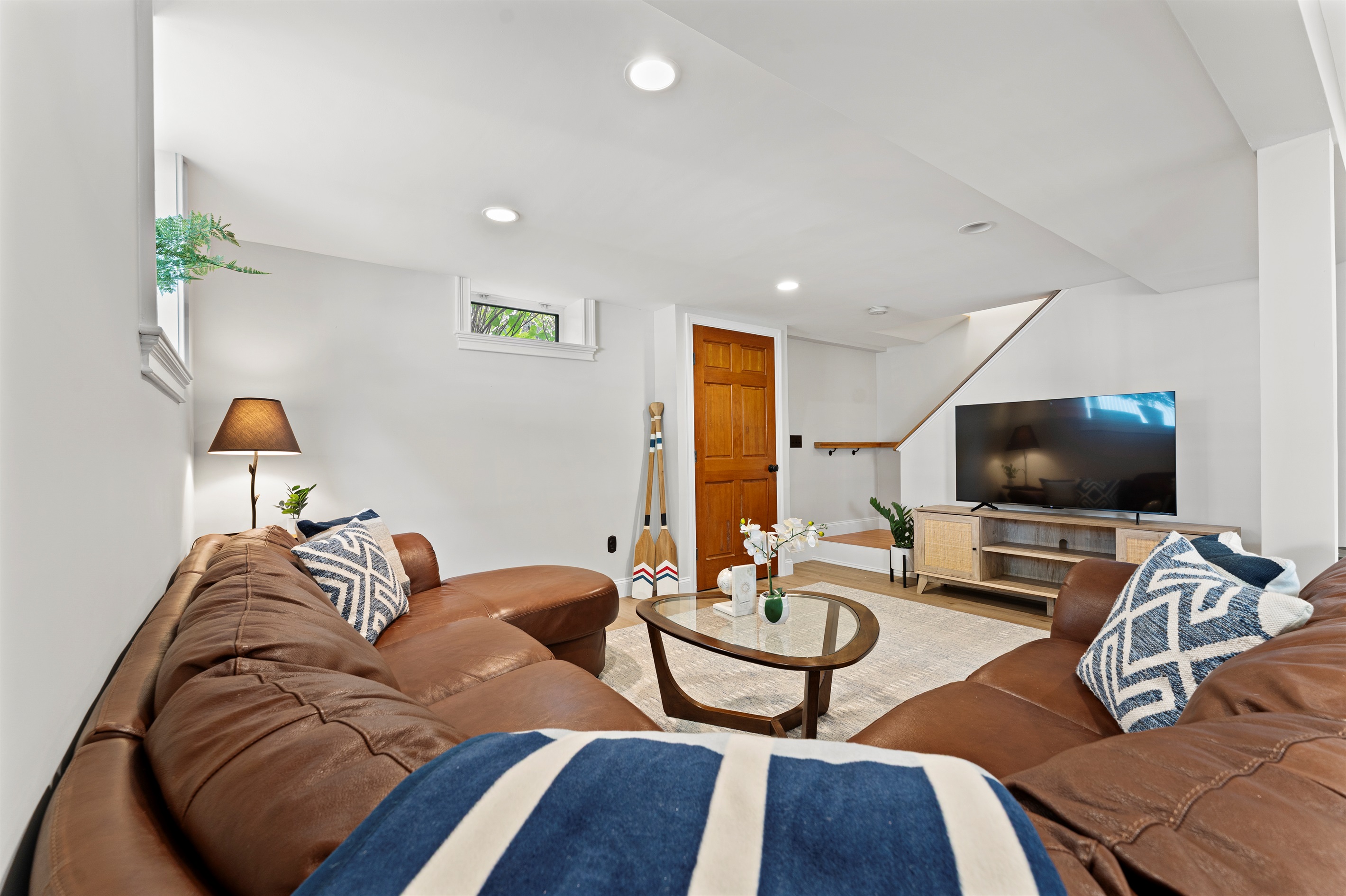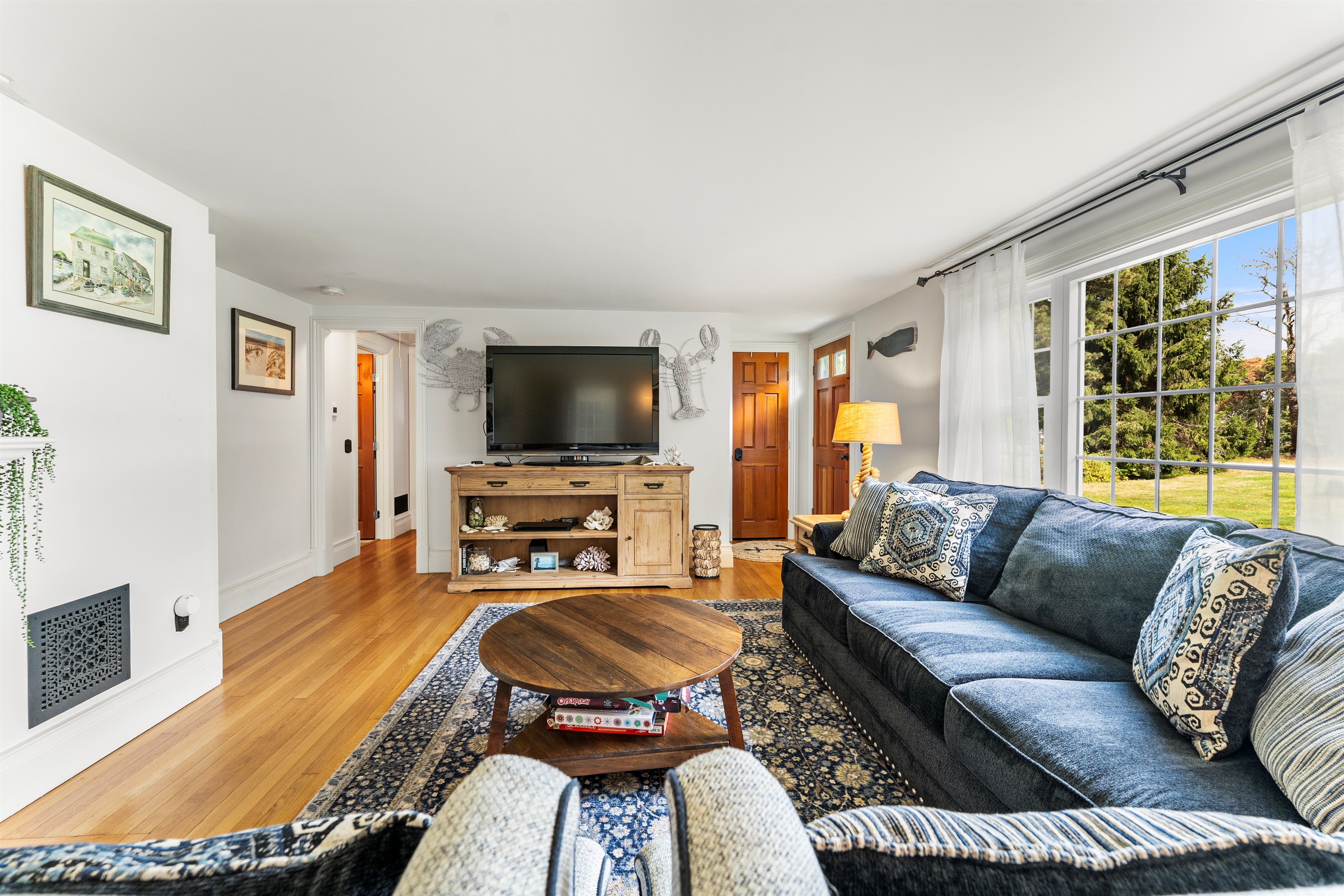 • The spacious living room offers a cozy space to relax, complete with a large TV — perfect for movie nights or catching up after a day exploring Cape Cod.