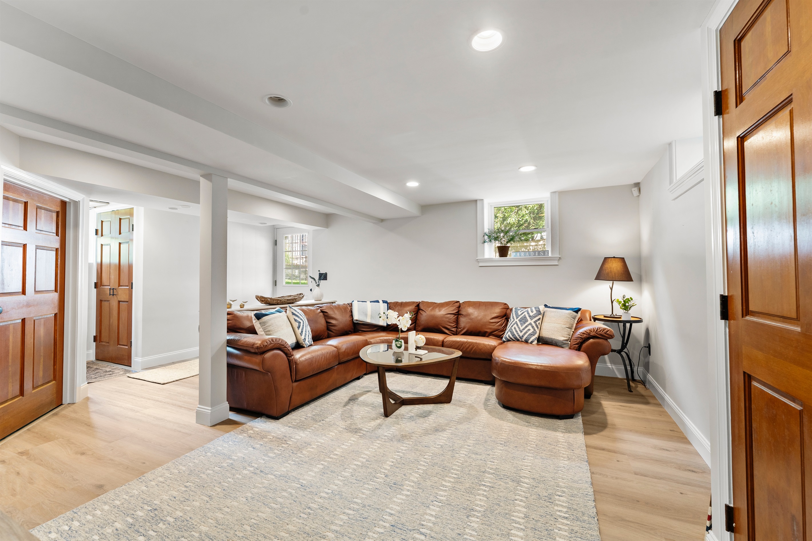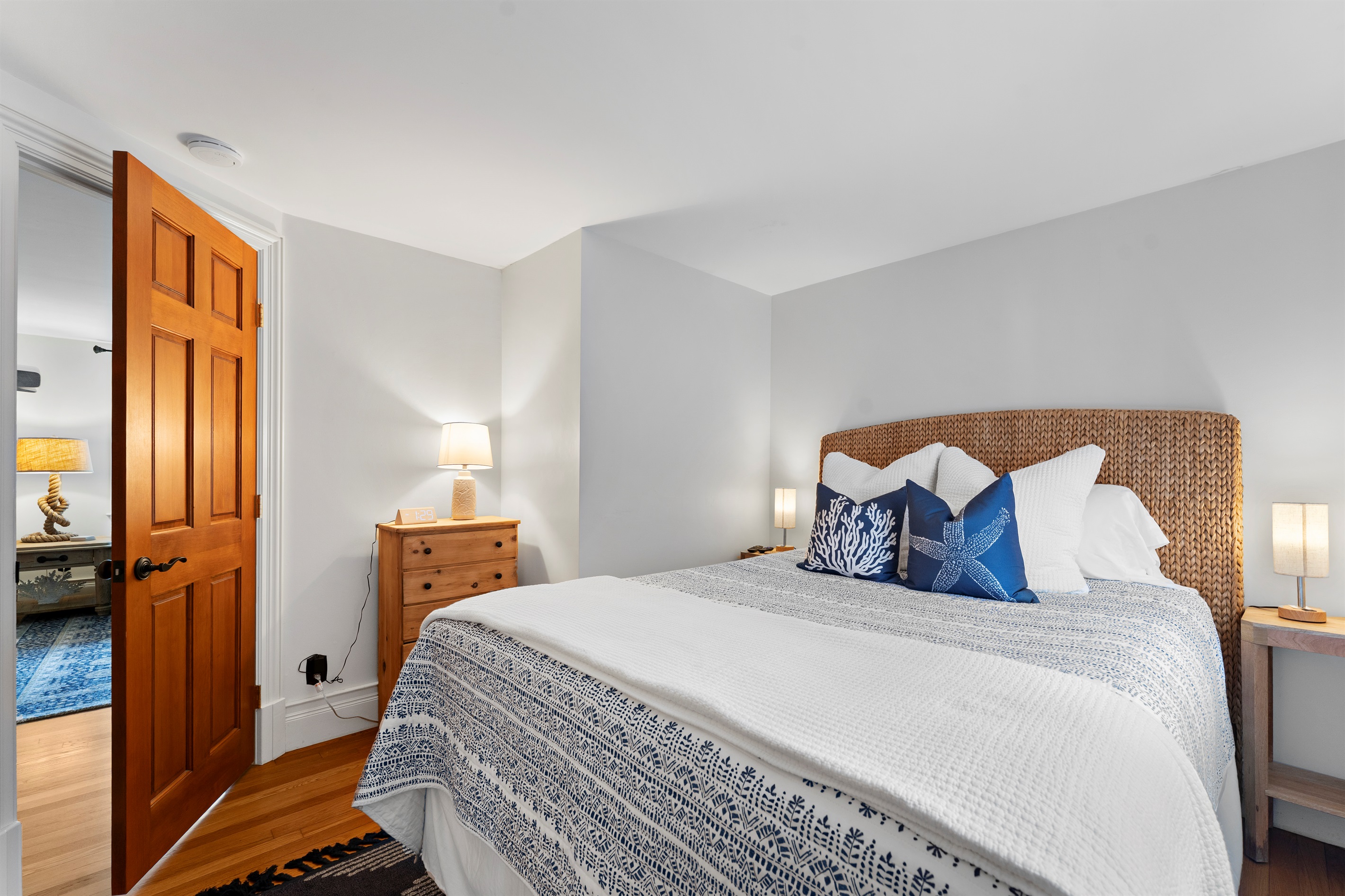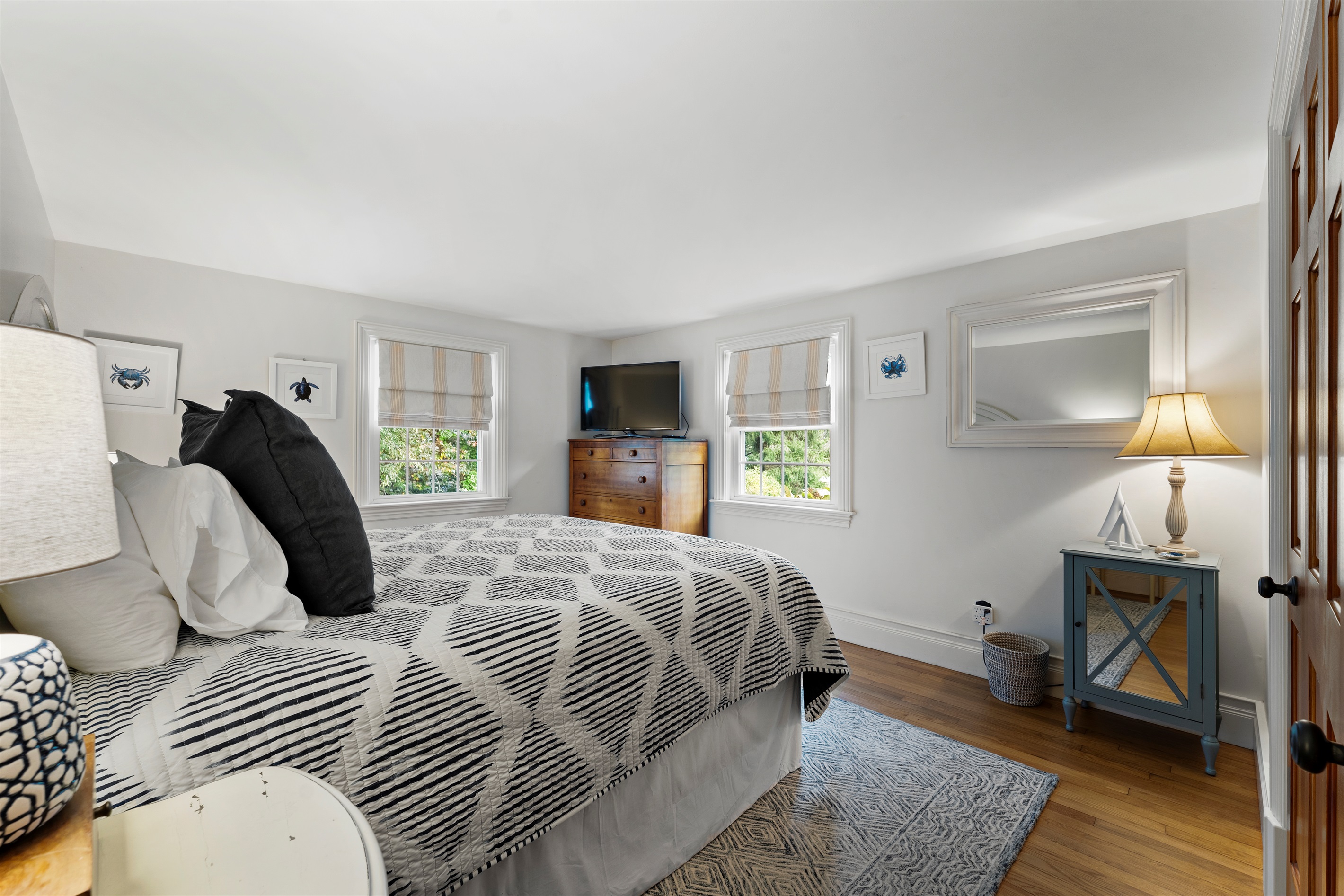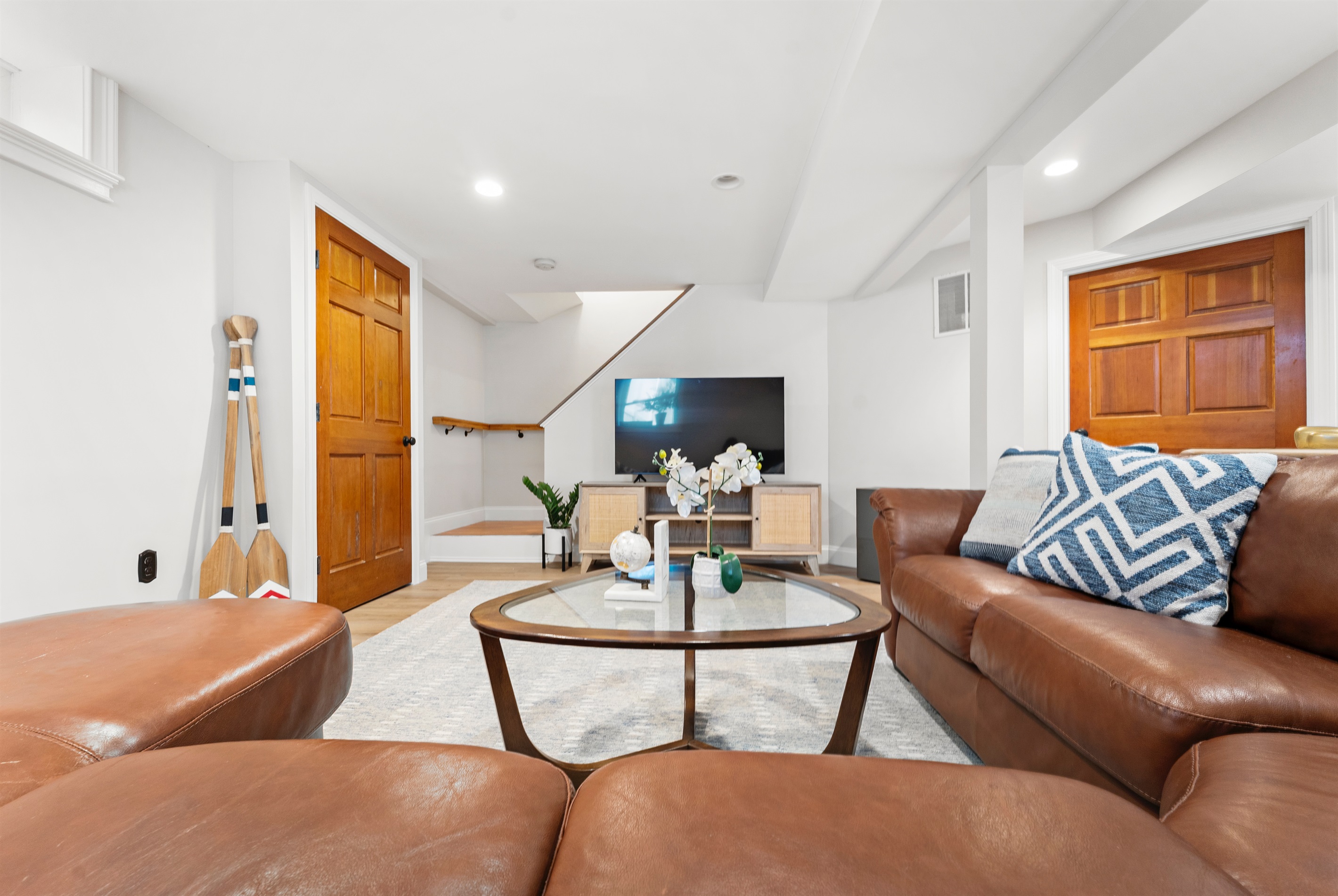 • The spacious living room offers a cozy space to relax, complete with a large TV — perfect for movie nights or catching up after a day exploring Cape Cod.